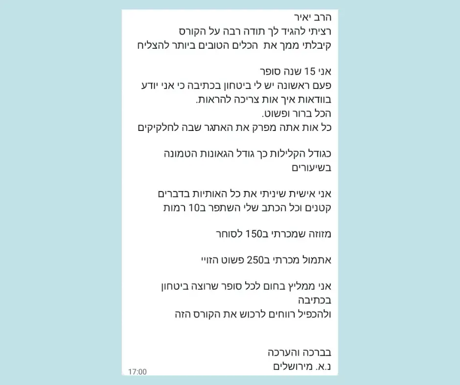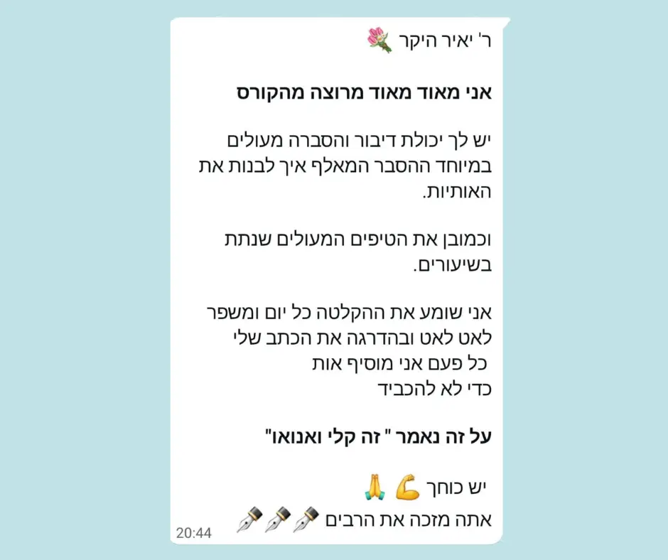 קורס לסופר סת"ם - קורס המשך - שיפור הכתיבה - ביקורת חיובית של תלמיד    קורס לסופר סת"ם - קורס המשך - שיפור הכתיבה - ביקורת חיובית של תלמיד קורס לסופר סת"ם - קורס המשך - שיפור הכתיבה - ביקורת חיובית של תלמיד  קורס לסופר סת"ם - קורס המשך - שיפור הכתיבה - ביקורת חיובית של תלמיד