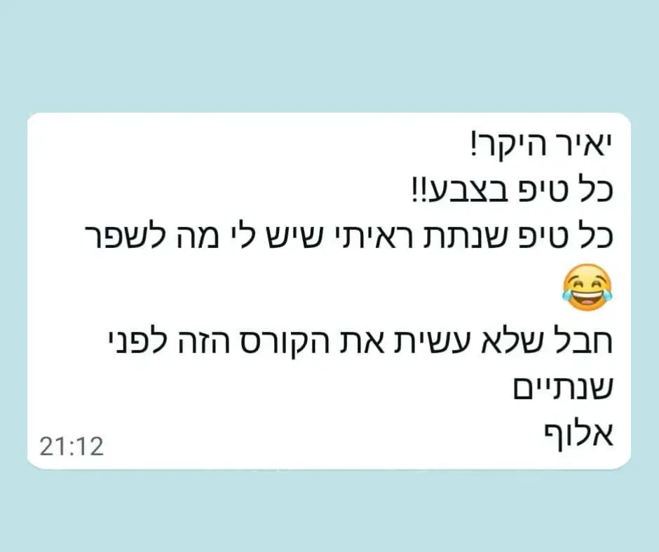 • ליווי אישי – תמיכה אישית עם מורה הקורס בקבוצת ווטסאפ עד להצלחה
