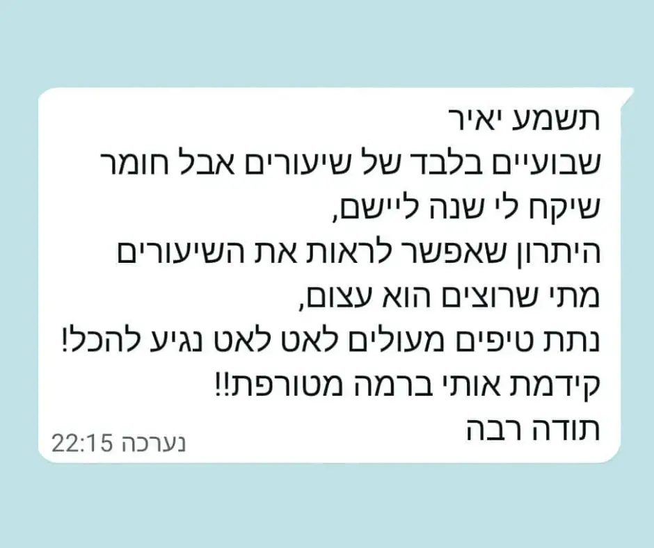 • שיעורים כסרטונים מוקלטים לצפייה בכל מועד וכמה פעמים שרוצים