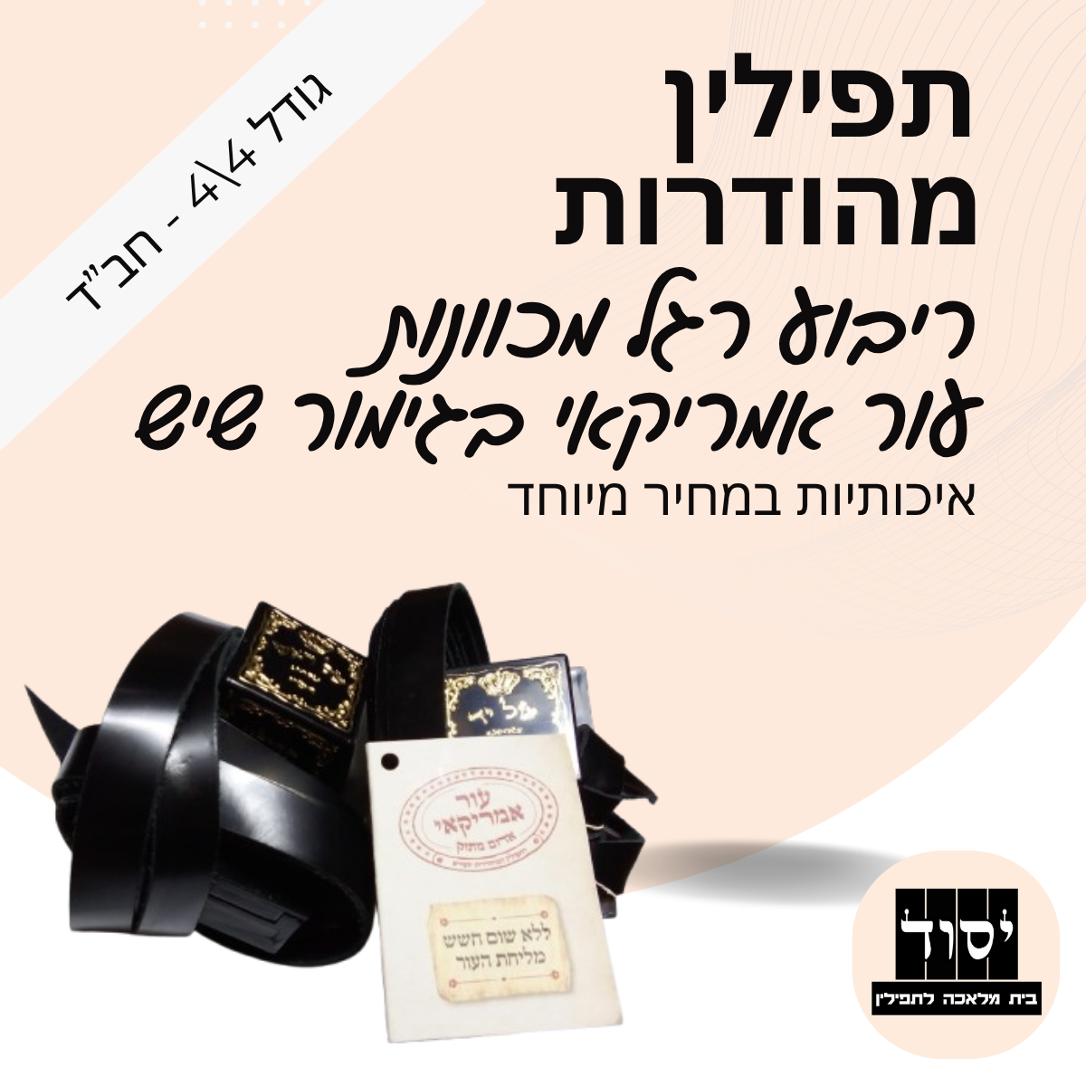 תפילין חב"ד מהודרות בהמה גסה | ריבוע רגל מכוונות – עור אמריקאי בגימור שיש – פרשיות תפילין מהודרות ורצועות עבודות יד 15 מ"מ